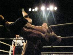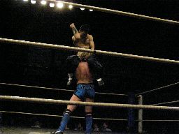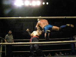 Actually Quiet Storm came to Japan many times but fans cheer Kenny more. Kenny and Quiet Storm got in the ring first and started the match. First moves were like Storm-lockup, Kenny-headlock and taking back, Storm-hammerlock to headlock, Kenny-throwing ropes and leapfrog jumps, Storm-legwhip, Kenny-huracanwhip. Then both touched their partner. Then Choun and Kim wrestled for a while and Kim touched Kenny.