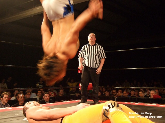 青いニットキャップに、ポイントに迷彩柄の入ったデカめのジャケット。ダボダボもパンツ。試合前のリングチェックで鳥人振りを発揮してました。リングチェックというよりもロープチェックだな、ありゃ。その後リングサイドでミーティング中のレフェリーの背中に蹴り、チョップ、ヘッドバッドなど各種暴行を加えてました。
