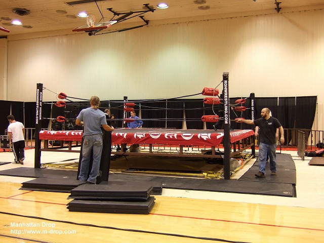 夕方5時にボストン到着。「おー!ココだ、ココだ!ココが記念すべきアメリカ第一戦目の会場だ!」と会場の前でテンションも上がり気味で写真を一枚。数分後に「あ、ココじゃないって、、。」と本開場へ移動。飯伏選手のお付の人的な振りをして開場前の会場にしれーっと入る事に成功。若手レスラー、練習生たちがリングを組み立てております。ほほう、ROHのリングはこういう感じですか、、。