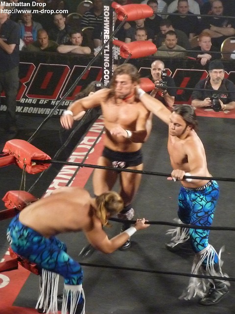 一瞬のすきにモクスリーがスモールパッケージホールド。エリーズは慌ててツーでキックアウト。オースティンはコーナーにいるモクスリーの顔面にランニング・ドロップキックを連発。フラフラになったモクスリーをブレーンバスター。するとモクスリーはくるっと体勢を入れ替え、オースティンにローブロー!モクスリーがサンセット・フリップを狙おうとするがオースティンがこらえる。するとオースティンがそのまま腰をおろしカウントスリー。オースティン・エリーズの勝利。