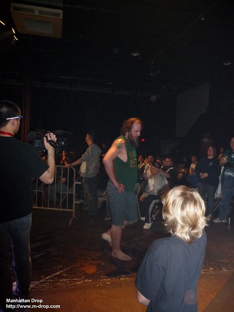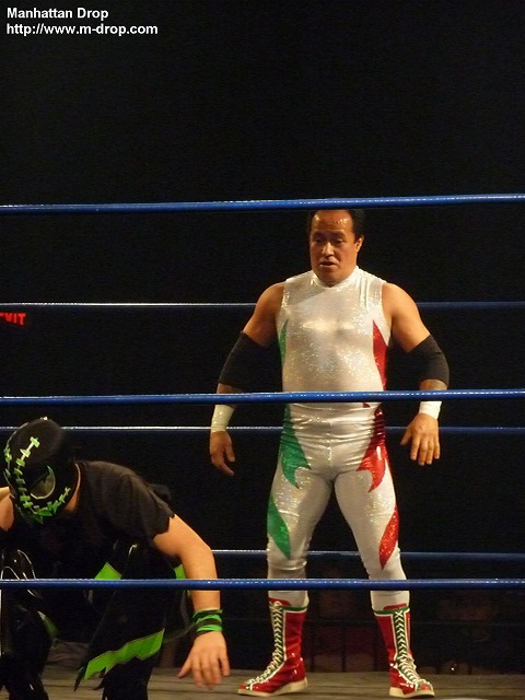 我らの顧問、ネクロ率いるデス・マッチ・キングス。トビー・クラインもブレイン・ダメージも血みどろデスマッチが大得意の、本当にデスマッチキングが揃ったチームなのだけれども、入場の時に何か違う…、と思ったら、ブレイン・ダメージが激太りしていて以前の2倍膨張していた。先日足をパックリ怪我したネクロさんはもう問題ないようで、相変わらずの裸足(但しテーピング有)。変なカンフーポーズを決めて本日のやる気を観客にアピールするネクロさん。その闘志を称えるかのように客席からはネクロコール。そしていきなりゴングを手にガンガン鳴らし始めて観客を騒然とさせるネクロさん。やはりファミリー向け、ほんわかムードのチカラでもいつもと何ら変わるところがありません。グラン・アクマがリング上に椅子を2脚投げ入れた際には、颯爽と椅子に座り、アクマ相手にグーパンチをお見舞いしまくっていました。ただここで注目すべきはトビー・クライン。デスマッチだけではなく普通(?)のレスリングでもかなり動きがよく、もっと評価されて良いレスラーなのです。そんなトビーのがんばりも空しく、チャック・テイラーのコーナーからの急角度のパイルドライバーでカウント3に沈んでしまい、残念ながらデス・マッチ・キングスはここで敗退