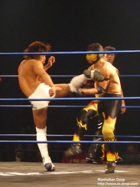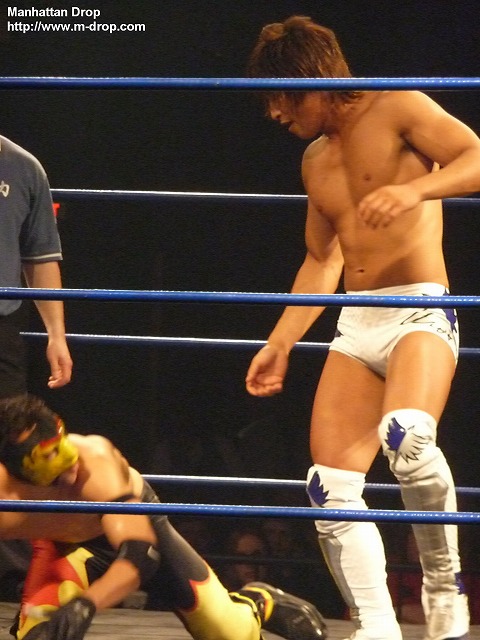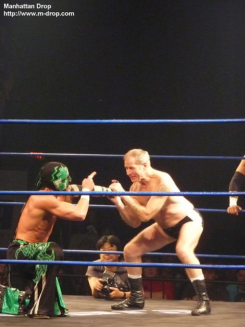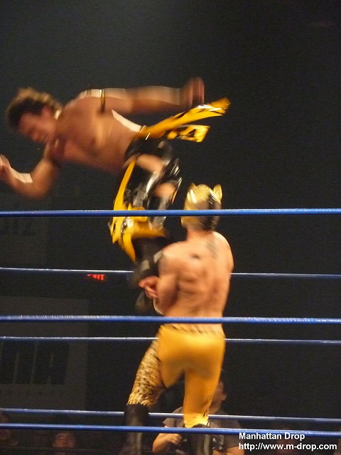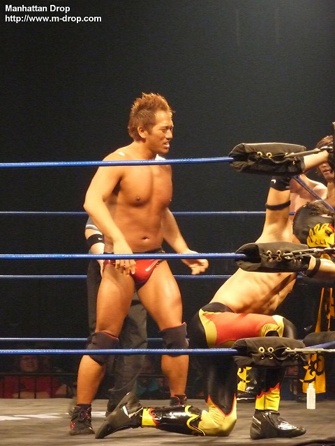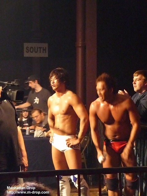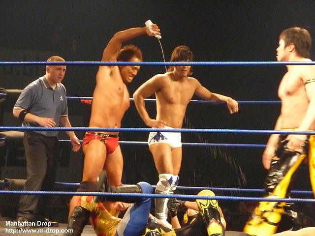 入場ゲートから出てきた途端、体にオイルをかけまくる巨匠マイケル中澤。リングに上がったら俺が出るとアピールし、飯伏とKUDOをコーナーに戻す。まずはリンス・ドラドと対戦するが、あまりのヌルヌルぶりにすべりまくるドラド。何をしても滑りまくりなので、汚い雑巾を持ってきて中澤の体を拭きだす。ヌルヌルが効かなくなった中澤はコーナーに戻りKUDOとタッチ。イクイノックスを相手にオーソドックスなレスリングを展開。ちなみにこのイクイノックス、基礎もしっかりできていてなかなか良い選手なのでお勧めです。次に飯伏とヘリオスがリングイン。ヘリオスは空中戦やちょっと危険な技を得意とする飯伏曰く「狂ってる」レスラー。なので想像通り飯伏とは手が合うわけです(笑)軽く相手の様子を見た後はまた中澤にタッチ。体に再びオイルを塗りたくり、ヌルヌル攻撃を出すとファンは大喜びで「ナ!カ!ザ!ワ!」と中澤コール。なぜ英語名のマイケルではなく中澤でコール?との疑問は置いておいて、客席からは”This is Awesome!”のチャントまで発生。その後中澤が捕まるが、キャメルクラッチをかけられている時に、相手にオイルをかけてヌルヌルにして上手く脱出。ここでもファンは大ウケ。ザ・フューチャー・イズ・ナウは基本ルチャのチームなので入れ替わりが目まぐるしく、ルチャっぽい試合展開に。ザ・フューチャー・イズ・ナウがそれぞれコーナーポストに上がり同時にムーンソルトを仕掛けるがこれはDDTの3人とも上手く避ける。その後飯伏かコーナーからの場外への三角跳びケブラーダ。この技には、会場もこの日一番の盛り上がり。リング上でイクイノックスと向かい合っている中澤は口にオイルを含んだものの、チョップを受けてそのままオイルを飲み込んでしまって自爆。リング上で横たわっているところ、フットスタンプをもらいオイルをはき出すことが出来てなんとか復活。が、そのまま丸め込まれて3カウントを奪われる。試合後には観客から大DDTコール。