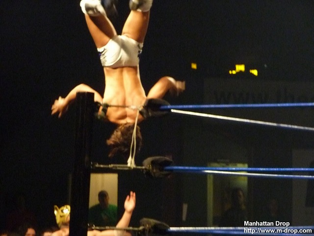 まずは観客からジョニー・セイント!ジョニー・セイント!の大コール。次にはスカイダ!スカイダ!の大コール。そして最後にクワック!クワック!で締め。ある意味この大会一番の目玉チームであるザ・マスターズ・オブ・サウザンド・ホールズに客席は大熱狂。対戦するインコーヒアレンスは見た目とは違い実力者揃いのため、一見噛み合わないように見えるけど、実はかなりの好カード。そんなファンからの声援もあって、満面の笑みのホルヘ先生(と日本人レスラーからは呼ばれています)とジョニー・セイント。まずはホルヘ先生がフライトメアと対戦。とにかく上手い。上手すぎる!!赤子の手を捻るようとはよく言ったもので、フライトメアの一挙一動を全て軽く流れるようにあしらって、客席からは感嘆のため息しか聞こえず。うーん、すごい。次にクワックとタッチ。一通りの技を出した後にジョニー・セイントにタッチ。セイントもこれぞキャッチ!と言った動きで、やはり感嘆の声しか出ず。アメドラさんがバックステージから顔を覗かせてこっそり見ていたのですが、やはり「Wow!」や「Oh, yeah!」などの感嘆の言葉ばかり発していたのが印象的。見よ、この吊り天井を!もう芸術作品としか言いようがありません。ホルヘ先生はクワックのアシストで場外へトペを敢行、その一方で見事なキャッチの組み合わせ技を披露したジョニー・セイントがデリリアスを丸め込み3カウントを奪取。