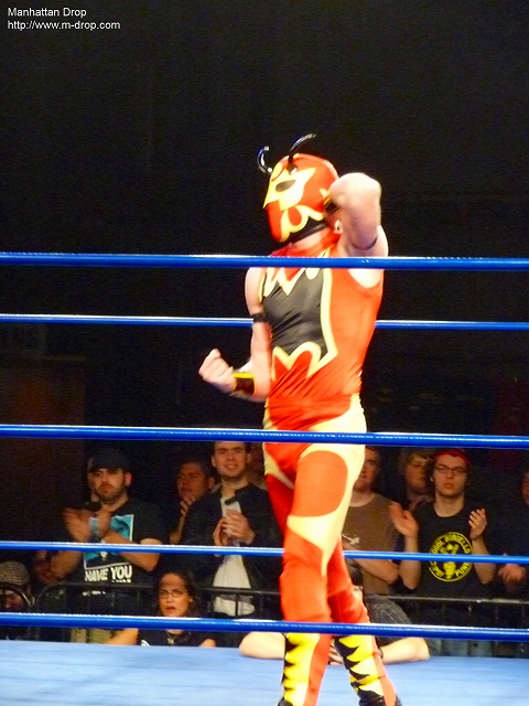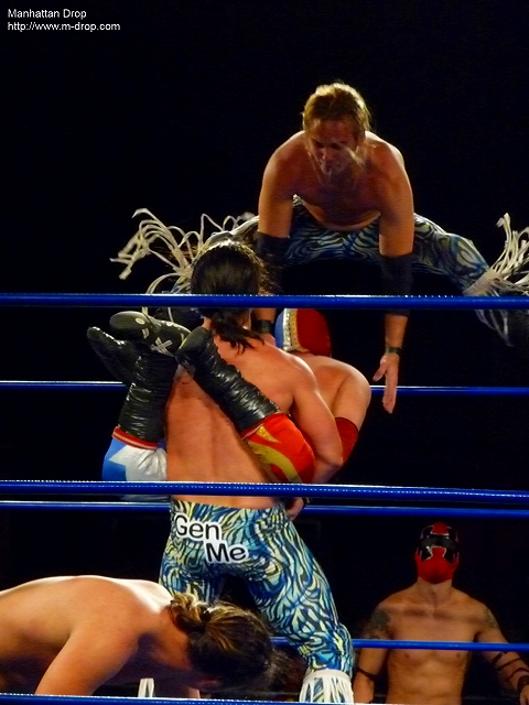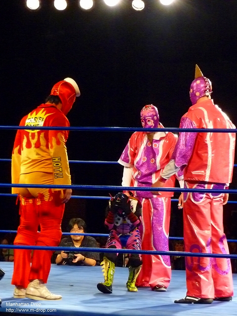個人的にどうしても生で見てみたかったクイヘが想像を遥かにこえた小ささで驚愕。エントランスから姿を表したときには観客からどよめきが起きるほど。存在からして反則というかミニという分野がいまでも存在しているルチャリブレすごいと思った。対するカレーマンとロス・アイスクリームスもある意味反則。見た目は派手でコミックな路線ではあるが、技の一つ一つがどれも正確でキレがあった。特に試合にはあまり関係のないカレーマンのカレーダンスがダンス甲子園で優勝できるくらいキレキレだった。メロリンQも真っ青だ。恐らく中の人はかなりのテクニシャンでダンスの達人であることは間違いないだろう。
