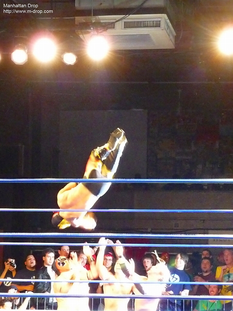 それに比べてアレブリヘが太り過ぎで動けなさすぎ。同じくオリエンタルも動きは鈍かった。やはりクイヘの一人舞台となった。クイヘが小さすぎて試合がやりづらそうにするカレーマン。ロス・アイスクリームスと一緒にクイヘだけを集中攻撃すると観客からはブーイングが。クイヘを見慣れていない観客も多かったはずだが予備知識は一切不要な気がした。最後はアレブ リヘがクイヘを空高く投げてそのままアイスクリームスをボディプレスで沈めた。観客からは「ルーチャーリブレー!ルーチャーリブレー!」の大合唱。こういったミニの試合が楽しめるのもキング・オブ・トリオスならではだろう。