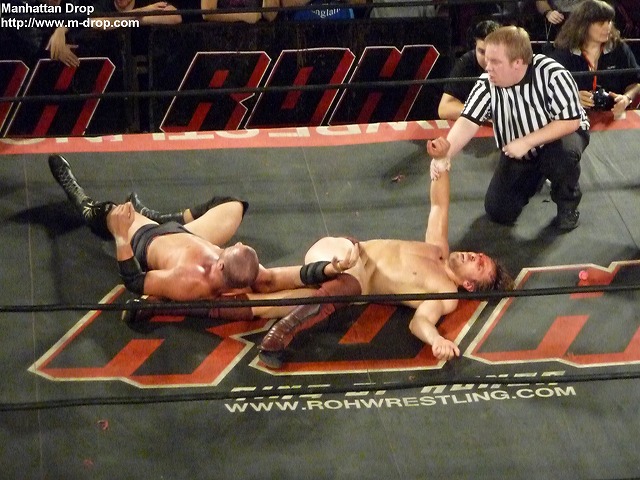 キラーとなったダニエルソンは鬼気迫る形相でナイジェルに頭突きをぶち込む。ふらふらになりながらも自らロープに振ってぶつかり合う両者。再度キャトルミューティレーションでナイジェルを弱らせて、すかさず三角締めに移行するダニエルソン。ギブアップしないとみるや三角締めのままナイジェルの頭部めがけてエルボーバッドを何度も何度も打ち込んでくと、見かねたレフェリーのトッド・シンクレアがここでレフェリーストップ。ROHファイナルマッチはブライアン・ダニエルソンの勝利。
