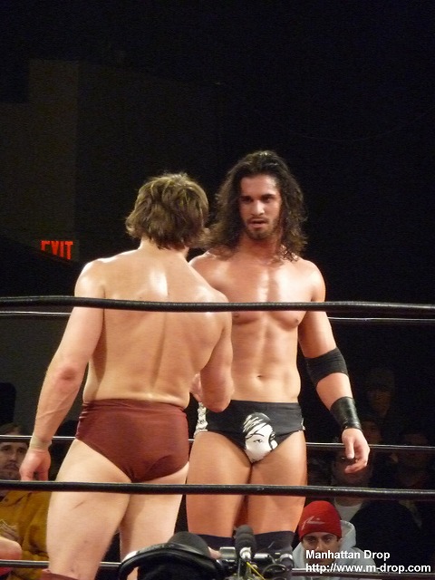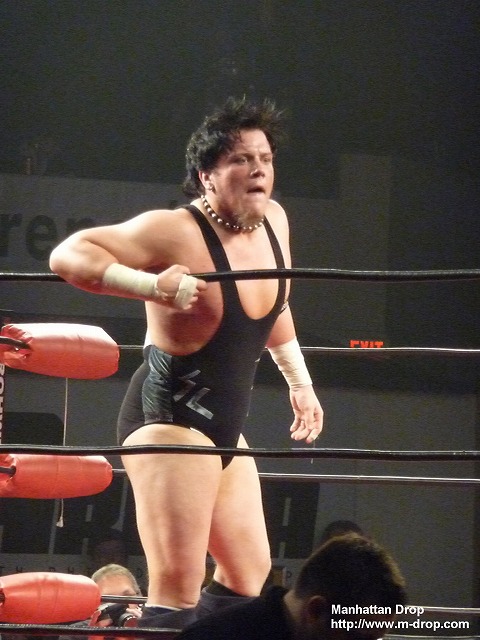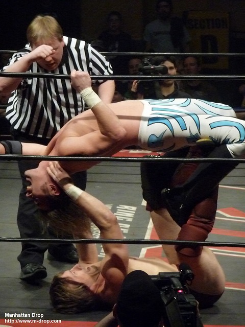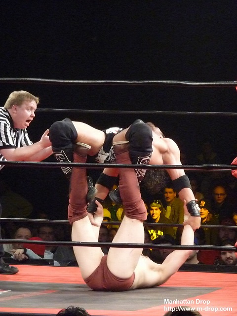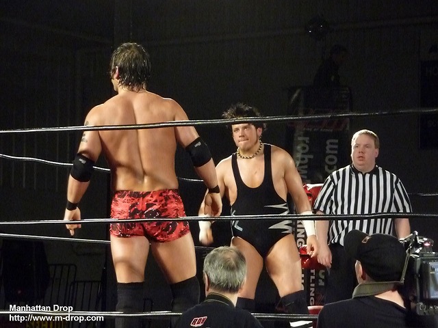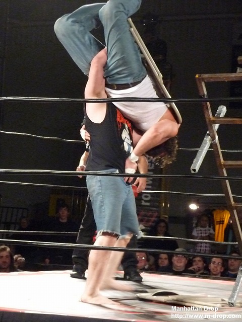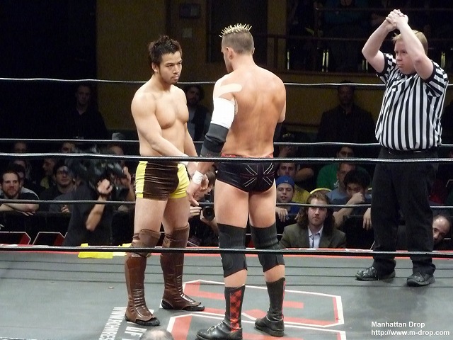 小さな子供が「Let’s Go D-Lo !!」と声援している。彼はそうとうマニアックなファンだ。ちらほらと「Boring!」チャントがあるなかジェイがコーナーポストからギロチンを狙うもディーロにかわされ自爆。それをすかさず丸め込んでディーロの勝利。一瞬なにが起きたのか狐に摘まれたようなフィニッシュだった。