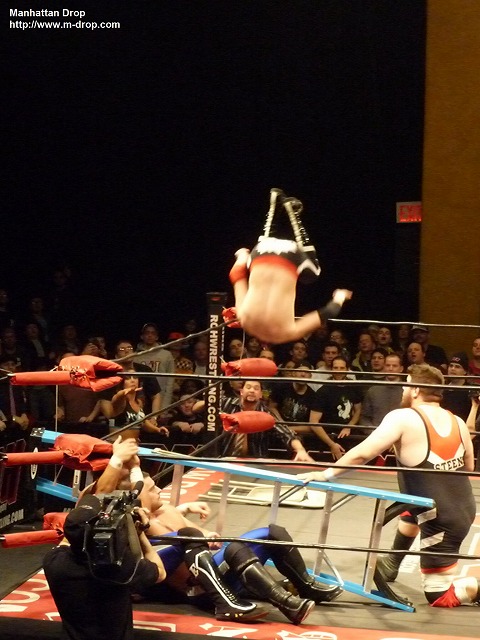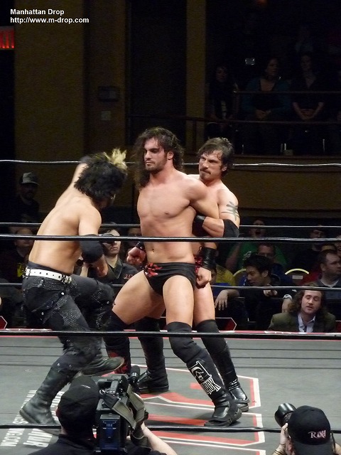 序盤はコルトとダニエルソンの小刻みなタッチワークでレイヴを孤立させていく。変形のボーアンドアローでタップ寸前のレイヴ。復帰戦でいきなり手厚い洗礼を受ける。やっと交代したバイソン・スミスはパワーレスリングで押しまくる。ダニエルソンがバイソンを客席へと投げ捨ててそのままニューヨーク恒例のトペ・スイシーダを決める。