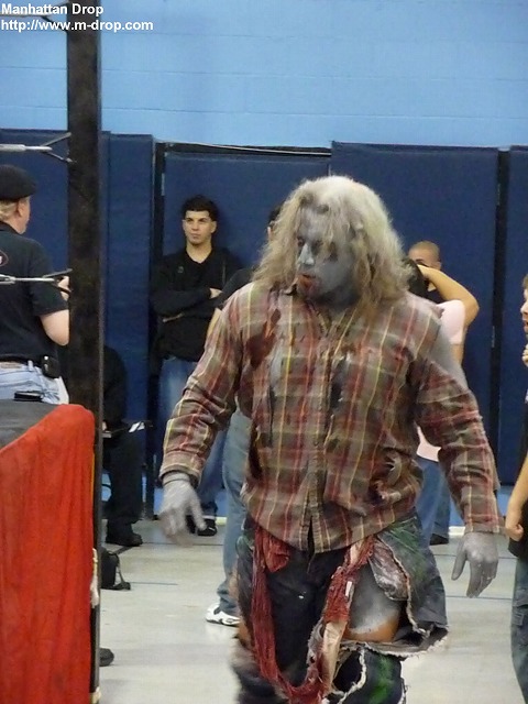 元ECW(WWE)のザ・ゾンビが走って入場してくると、血だらけの口で「ウガー!」と叫びながらファンを追っかけ始める。ロボットの次はゾンビである。素晴らしく出オチな感じ。