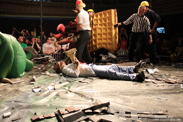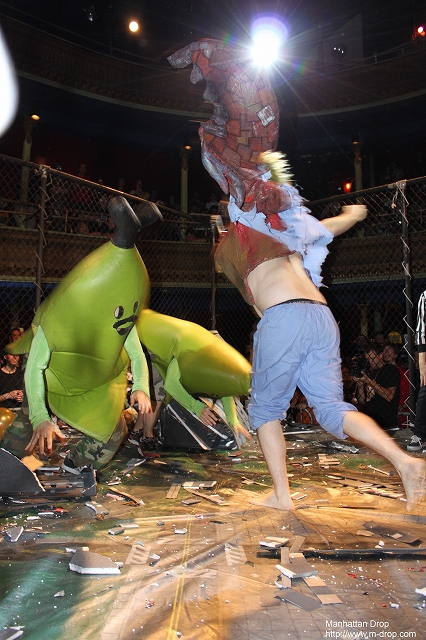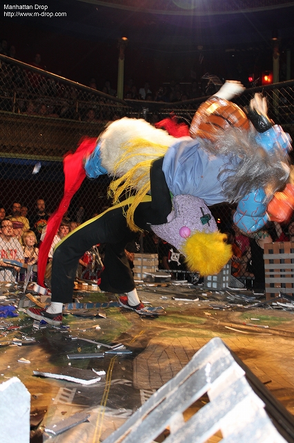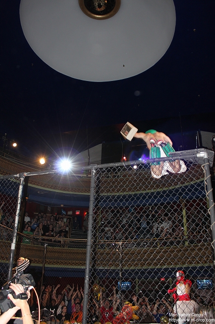 なんと今回のリングは金網!始まる前から何かが起こりそう…という雰囲気。と思いきや、スケルターのカラオケショーが前座として始まり、3曲をノリノリで歌って観客を温めました。そしていよいよショウが開始。すると観客から「We want monsters!」コールが…。「今回のショウは怪獣ビッグバトル殿堂セレモニーなので、試合は一切行いません」と告知していたにも関わらず、実況のラウデン・ノクシャスとジュニアレフェリーのニクマンがリングに上がるや否やコール・ミー・ケビンがリングへ乱入。それを追って正義の味方サンバスターが慌ててリングへやってくる。怪獣の乱入を予想していなかったサンバスターはシャワーを浴びていた最中らしく、腰にバスタオルを巻いたままケビンと大格闘。バスタオルが邪魔だと感じたサンバスターは、金網トップに登るとバスタオルをはがし、そのままケビン目がけてサンバスター・スプラッシュ。パートナーのパワ・ランジュルの援護もあって、見事サンバスターが勝利。