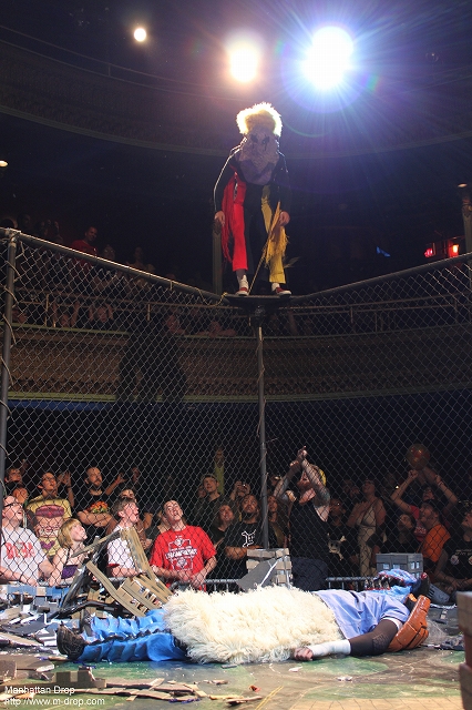 ロングの亡骸を死体袋に入れ、リングから引き上げるスタッフ。そしてスーパー・ロングを弔うためのレクイエムを歌うラウデン。歌い終わったら「いつまでもクヨクヨはしてられません」と言い、次のセレモニーに移るラウデン(笑)再びキューブがやってきて、相変わらずの俺様スピーチをしだすと怪獣達が次々とリングに上がり、もはやロイヤルランブル状態。グルーディンやD.W.サイクロプトパスⅢといったヒール達に真のヒーロー、ネオ・テッペンが立ち向かうも苦戦を強いられる。