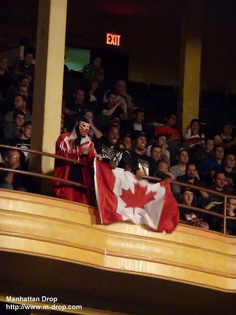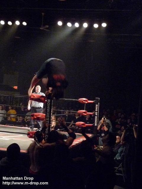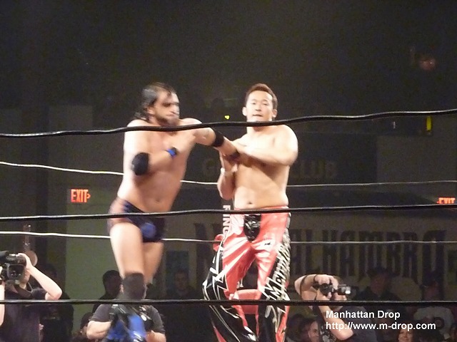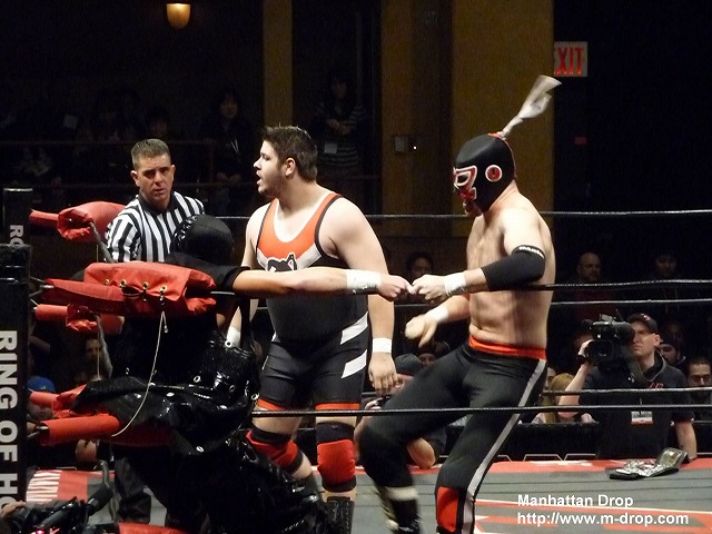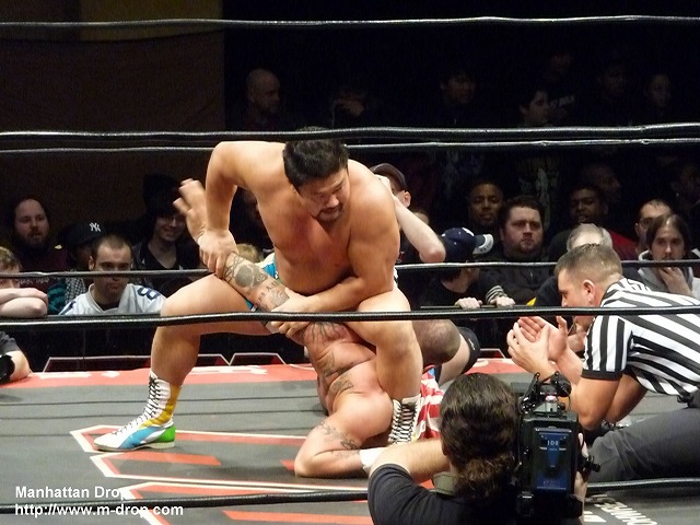 場外でダウンするネクロへ森嶋のボディアタックが炸裂。フーラフラのネクロをリングにあげてコーナーに座らせてランニングヒッププッシュ。しかしここでまたしても大ネクロコール発生。やられればやられるほどネクロコールが大きくなっていく。そしてなんと森嶋に向かって中指を立てるクレイジーなニューヨークの客が続出。会場の声援に奮起したネクロが森嶋をボディスラムで投げようとするが、さすがに重いのかヨタヨタとよろけてしまい完璧には投げきれない。会場からは軽く失笑が。またもや森嶋の一方的な攻撃がはじまる。無意味な側転からのボディアタックで完全にのびてしまうネクロ。新宿駅の裏手にいるその日暮らしの方々のような見事なのびっぷりが目に焼きつく。泣ける。