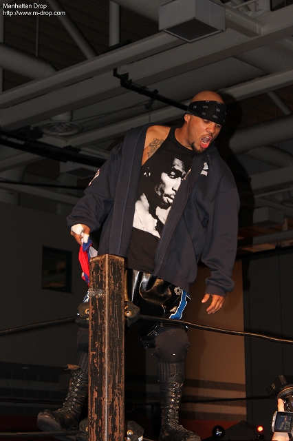 客席を練り歩く二人。モクスレーをテーブルに寝かせてシャッターに登りそこからホミサイドがダイヴ。テーブルがぐんにゃり。モクスレーがパイプ椅子でホミサイドの左肩をバコバコと殴りつける。動きが止まったホミサイドをフェンスに叩きつけると頑丈なはずの鉄製フェンスが大きな音を立てて倒れる。
