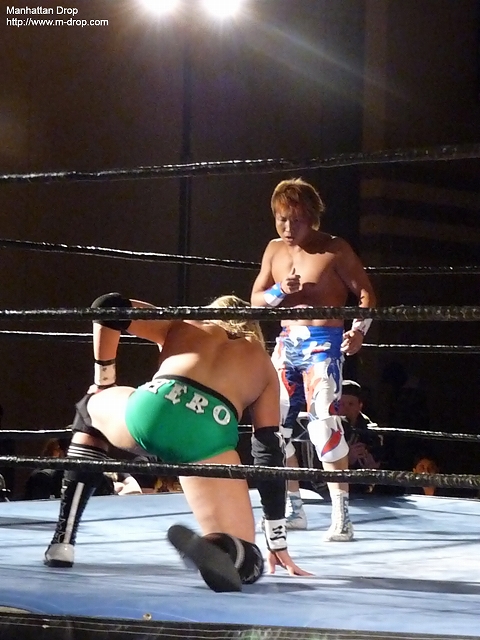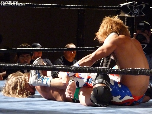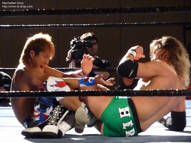 メインイベントは、かつてECWに参戦していた日高郁人と、現在アメリカインディー界でカリスマ的存在のクリス・ヒーローが初対戦。日高のセコンドにはブラッド・アレンが、対するクリス・ヒーローにはクロウディオ・キャスタニョーリがついていた。ゴングと同時に蹴りをくりだしていく日高。徐々にグラウンドの攻防へと移行していく。